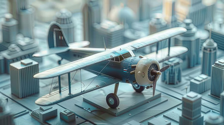 A detailed three-dimensional render of a cartoon cityscape featuring a vintage biplane set amid futuristic buildings. Perfect for creative projects or illustrations.