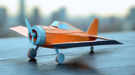 A detailed paper model of an airplane is displayed on a wooden table. Vibrant orange and blue colors highlight the craft, while a blurred city skyline serves as a backdrop in bright daylight, adding an urban feel.