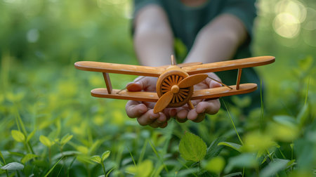 Cute boy playing with toy airplane . The child holds a toy airplane in his hands against the background of nature.