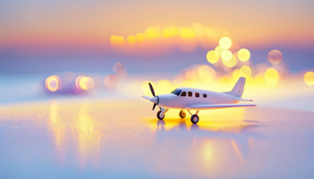 Nostalgic metal aircraft figures rest on a rustic wooden table, bathed in warm sunset glow, evoking memories of childhood dreams and bygone skies.
