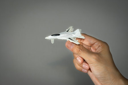 Minimalist composition with a silver children's toy airplane on a gray background. Top view, copy space