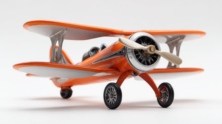 Vintage orange biplane model with detailed propeller and landing gear on white background, perfect for aviation and transportation themes.