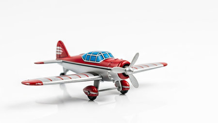 A miniature red and silver airplane is presented against a stark white backdrop. The aircraft exhibits a glossy texture with detailed wings and a propeller. The composition features overhead lighting, enhancing the object's form. Suitable for commercial projects illustrating travel, flight, and transportation.