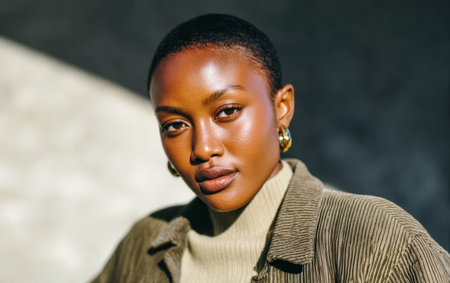 A confident woman with a short haircut poses with assurance, wearing a fashionable outfit. Sunlight softly highlights her skin, creating an elegant look.