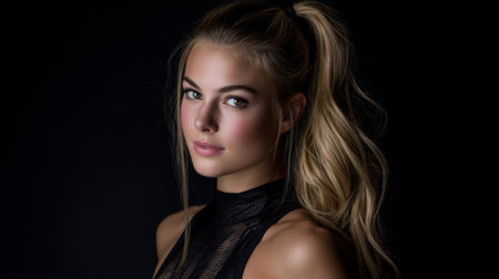 Captivating portrait of a young woman with long hair styled in a ponytail, showcasing beauty and confidence against a dark backdrop.
