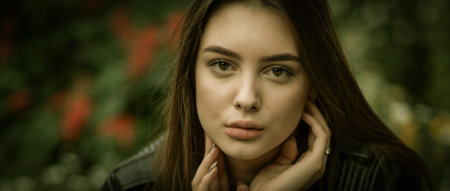 A captivating portrait of a young woman outdoors with long, flowing hair. Her serene expression and soft light create an atmosphere of beauty and tranquility.