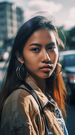 A captivating portrait of a confident young woman showcasing artistic apparel. The unique design and striking lighting create a powerful visual impact, embodying style and individuality.
