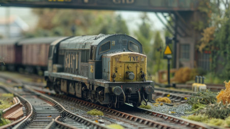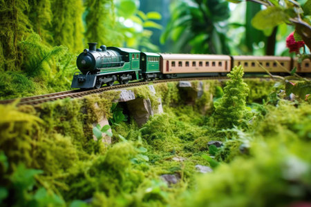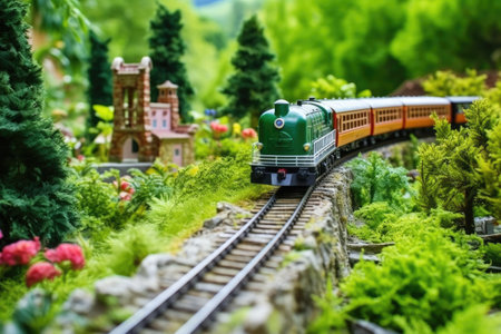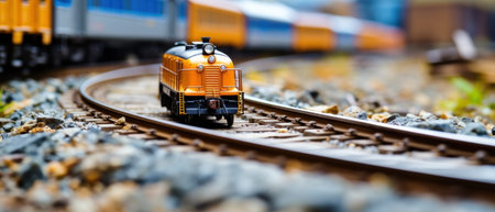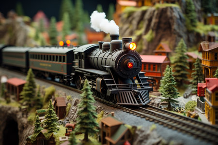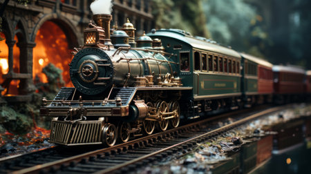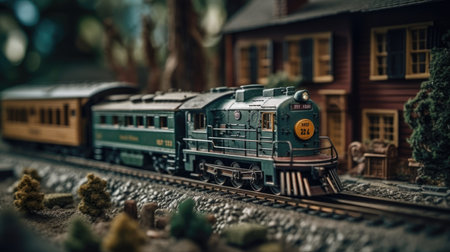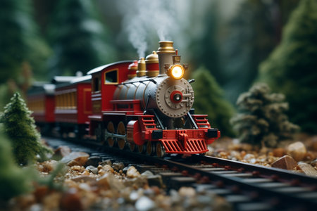 Toy-like train model captured in a nostalgic scene. A high quality image making by generative ai.