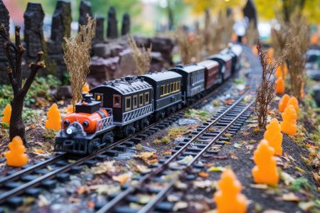 miniature halloween ghost train on track lined with gravestones, created with generative ai