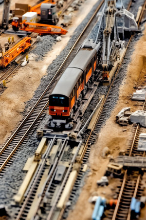 an insanely detailed and intricate train set is captured in this photograph. shot on a 25mm lens, the image showcases ultra-realistic details with a depth of field and tilt blur effect. the lighting, including half rear lighting and backlight, creates a dramatic and elegant atmosphere. the photo is enhanced with various techniques such as super-resolution, volumetric effects, and screen space reflections. the result is a