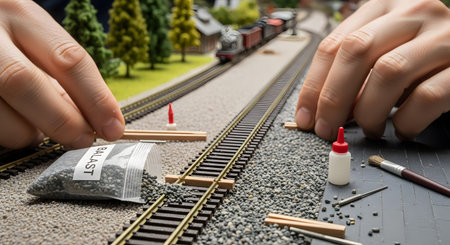 Close-up of a person's hands carefully adding ballast to a miniature model train track. This detailed work showcases the precision and patience required for the hobby of model railroading and creating dioramas.