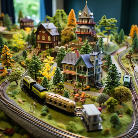 Get ready to be amazed by 'The Marvel of Model Trains'! In this image, a meticulously detailed model train set takes center stage amidst a picturesque landscape. The scene features lush greenery, miniature buildings, and a winding railroad track, creating a captivating and awe-inspiring view. The train itself is the highlight of the image, with its vibrant colors and intricate design drawing the attention of viewers. This artwork evokes a sense of wonder and nostalgia, showcasing the meticulous craftsmanship and attention to detail put into creating this miniature world. The scene is perfectly lit to enhance its visual appeal, accentuating the stunning beauty of the model train landscape.
