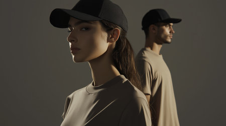 Two models wearing matching beige shirts and black caps pose against a dark background in a contemporary fashion photoshoot