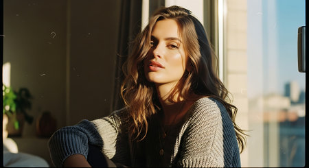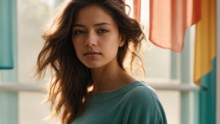 A young woman stands indoors with long hair. She looks directly at the viewer with a neutral expression. Sunlight enters through a nearby window, highlighting her features.
