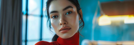 Elegant young woman in chic red turtleneck with her home interiors as background