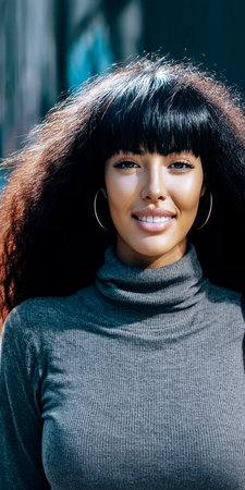 A woman stands confidently outside showcasing her curly hair and warm smile. She wears a gray turtleneck sweater exuding a relaxed and stylish vibe in the bright sunlight.