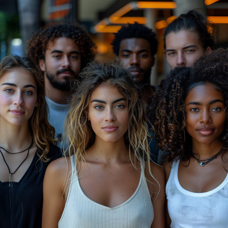 Diverse group of young people looking at camera outdoors in city while posing against wall with fun silver decorations
