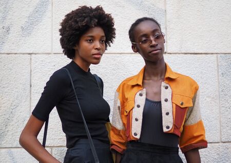 MILANO, Italy: September 21, 2018: Fashionable women in street style outfit on Arengario stairs after ACT 1 fashion show during MFW fall / winter 2018 / 2019.2018 / 2019.