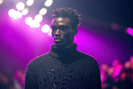 Confident man walks down runway in sleek black sweater, embodying modern menswear trends and captivating high fashion audience.