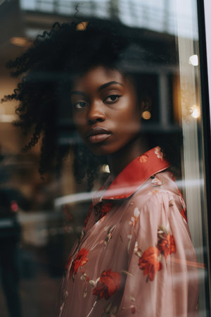 dreamy street photo cute pretty young woman glass window reflection glare glowy sadness
