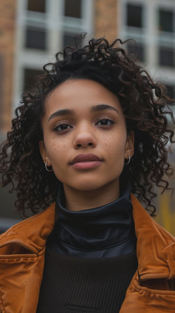 A young woman with curly, dark hair and a brown jacket stands in front of a brick building, looking directly at the camera with a serious expression.