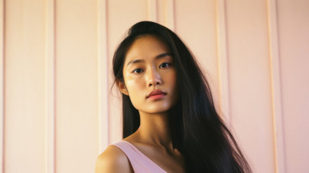 Portrait of beautiful Asian woman on pink wall background, model is Thai Ethnicity.