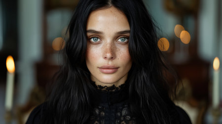 Studio head and shoulders portrait on gray of a beautiful serious young woman looking directly at the camera, black t-shirt, banner, copy space