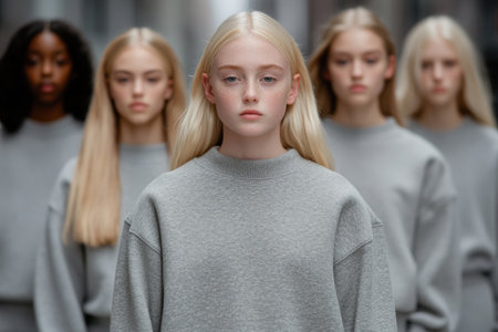 Four fashionable women standing together in stylish outfits, embodying friendship and confidence. Ideal for concepts of fashion, diversity, and togetherness.