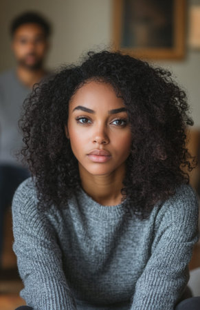 A Black woman with curly hair sitting in a living room, looking sad after a fight