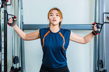 Young fit woman doing exercise in a crossover exercise machine. Healthy lifestyle concept. Bodybuilding and Fitness