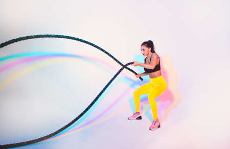 Fit woman training hard with ropes. Girl making exercizes in the gym. Concept about bodybuilding and lifestyle