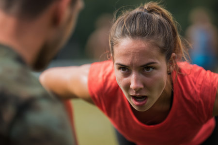 Two individuals participate in a challenging training routine in a park, displaying focus and determination. The setting shows a lush backdrop with other athletes nearby.