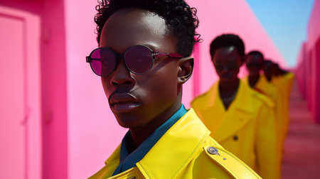 Fashionable male model wearing unique sunglasses stands against a bright, colorful backdrop, highlighting modern aesthetics and creative visual storytelling, AI generated