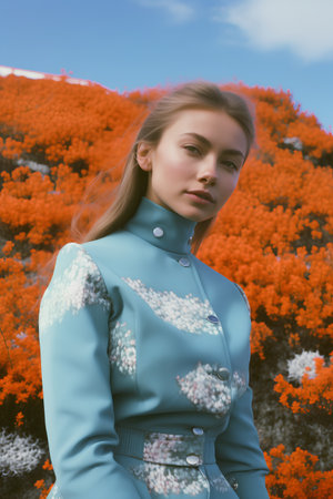Portrait of a beautiful girl in a blue coat on a background of yellow flowers