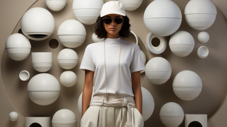 Young female model posing with trendy fashion outfit and colorful green optical art abstract background. Picturesque generative AI
