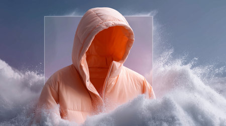 Warm puffer jacket floating in clouds during a bright, wintry day in an abstract, dreamy setting