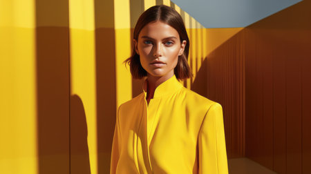 Horizontal banner portrait of a young fashion model wearing yellow clothing isolated from the background. Generative AI.