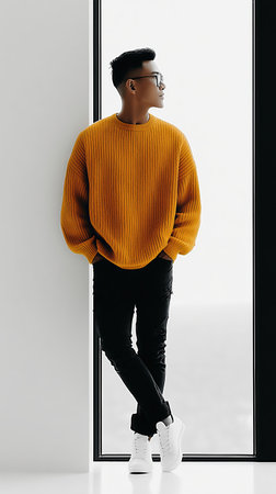 A stylish young man with crossed arms stands against a bright yellow background, exuding charisma.