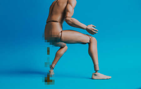 Male doll on a blue colored background. mannequin body parts close up