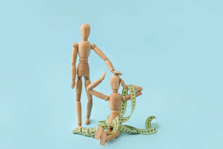 Wooden mannequins and measuring tape on color background