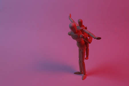 Two puppets impersonating a guardian and a child fooling around piggy back in red blue neon light. Spending time together