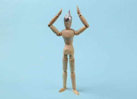 Wooden puppet in a foil hat on a blue background. Conspiracy