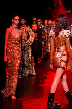 MILAN, ITALY - FEBRUARY 23: Models walk the runway finale at the Roberto Cavalli fashion show during the Milan Fashion Week Fall/Winter 2022/2023 on February 23, 2022 in Milan, Italy.