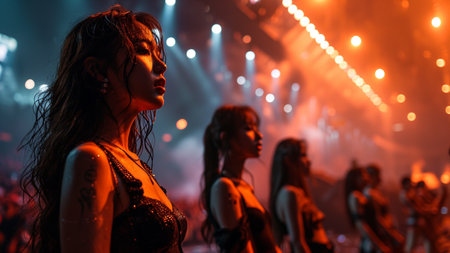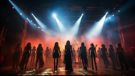 Fashion show in the night club. Group of beautiful young women dancing on the catwalk.