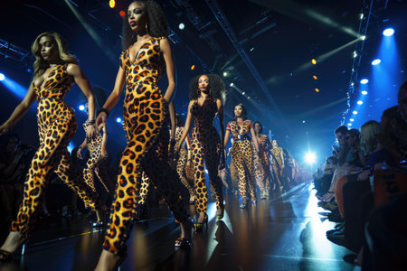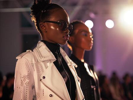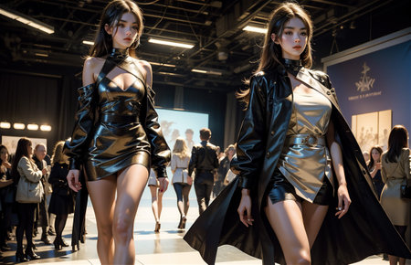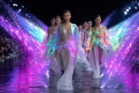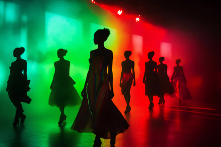 A captivating fashion show featuring models walking the runway in stunning outfits. The venue is illuminated with striking lights, creating a glamorous atmosphere.