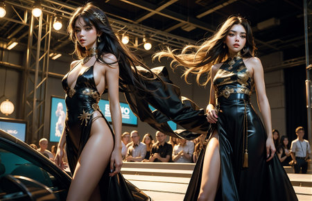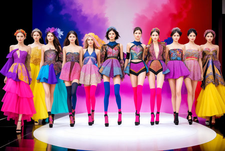 Fashion show.Gorgeously beautiful womans catwalk colorful extravagant outfits.Digital creative designer fashion glamor art.