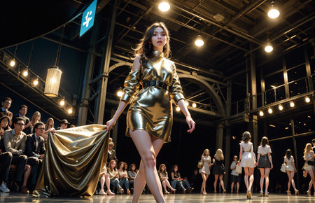 Fashion show runway event with models showcasing designer clothing at a themed fashion week event. Concept Fashion Show, Runway Event, Designer Clothing, Themed Fashion Week, Models