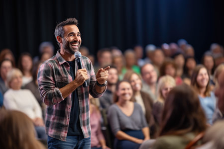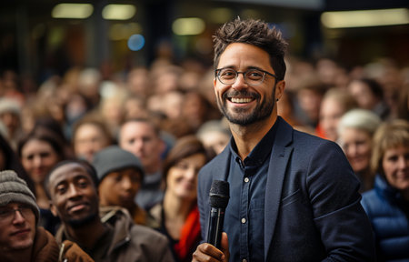 A man confidently addresses a crowd using a microphone, capturing public speaking, engagement, and leadership in a presentation setting.