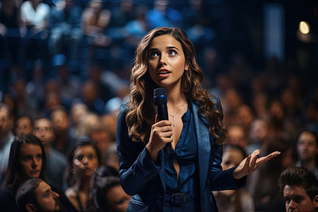 A woman in a suit is giving a speech. Generative AI.