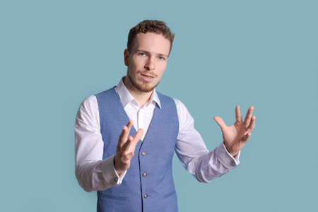 Portrait handsome business man with charming smile, gesturing with his hands while standing at casual post as if talking on a blue background. Caucasian guy leads successful negotiations